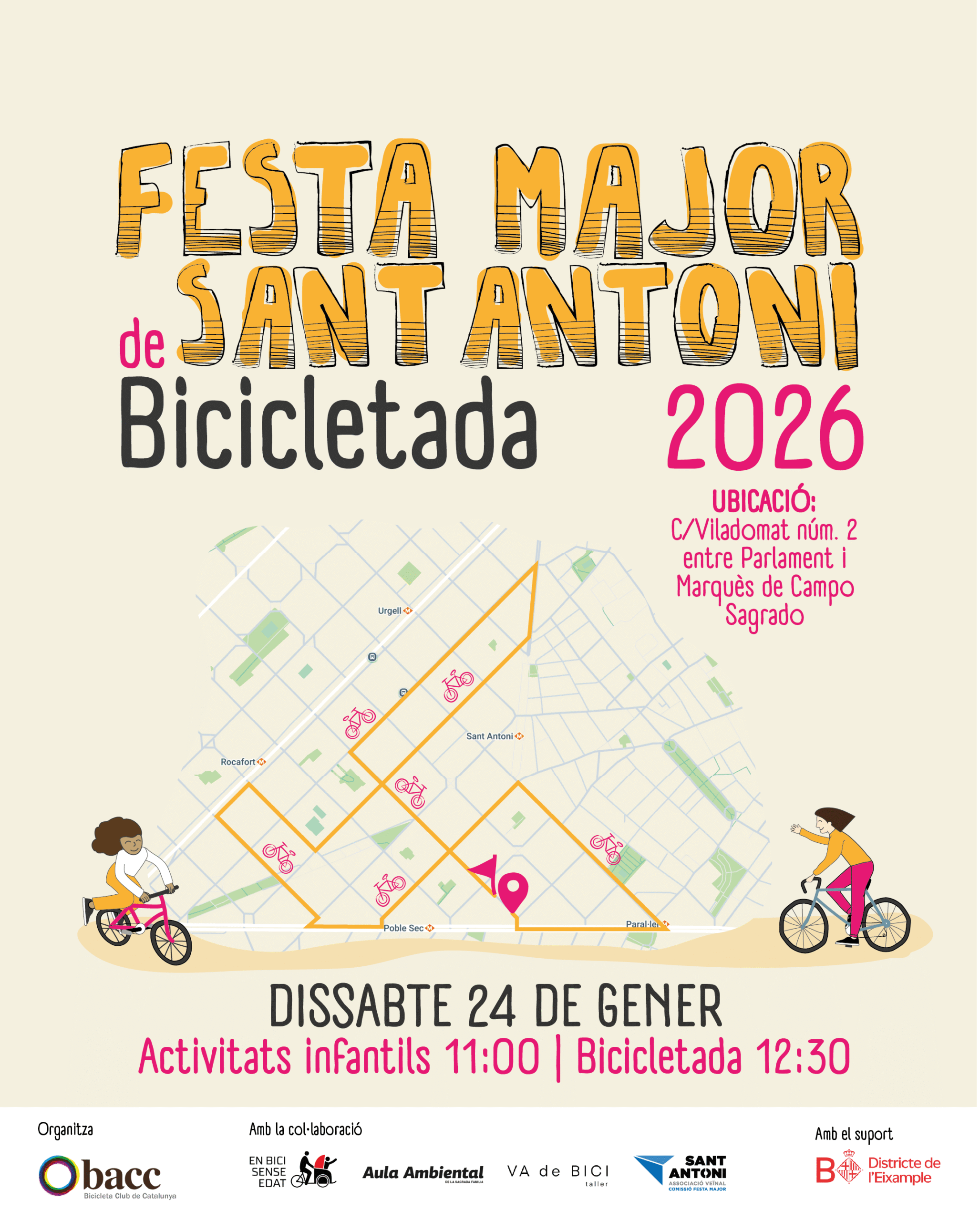 - A les 12:30-12:45 h donarem pas a la ja tradicional Bicicletada de la Festa Major del barri de Sant Antoni. El recorregut de 6 km està pensat perquè tothom hi pugui participar.